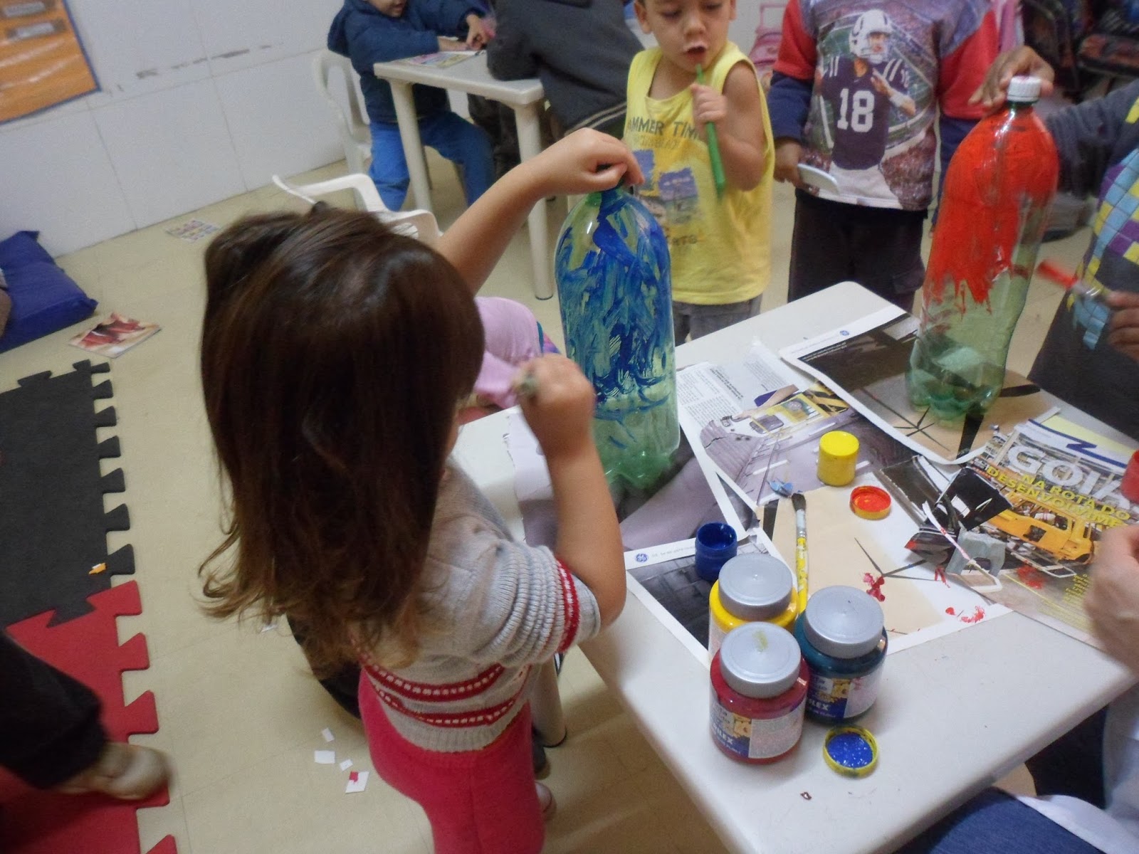| Pintando as garrafas PET para fabricar um brinquedo |