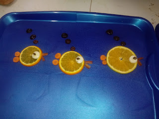 divertida. Foram usados frutas e legumes e as crianças puderam montar peixe com